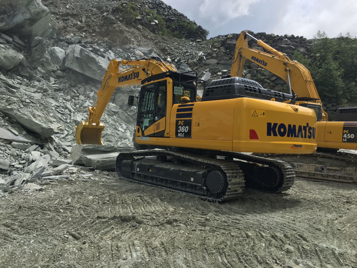 Raupenbagger, Zulassung im Jahre 2021. Dieser befindet sich im Steinbruch Agnisci und ermöglicht den Arbeitern einen sicheren und präzisen Abbau. Seine schnellen Bewegungen garantieren beste Lenkbarkeit und hervorragende Leistungen.